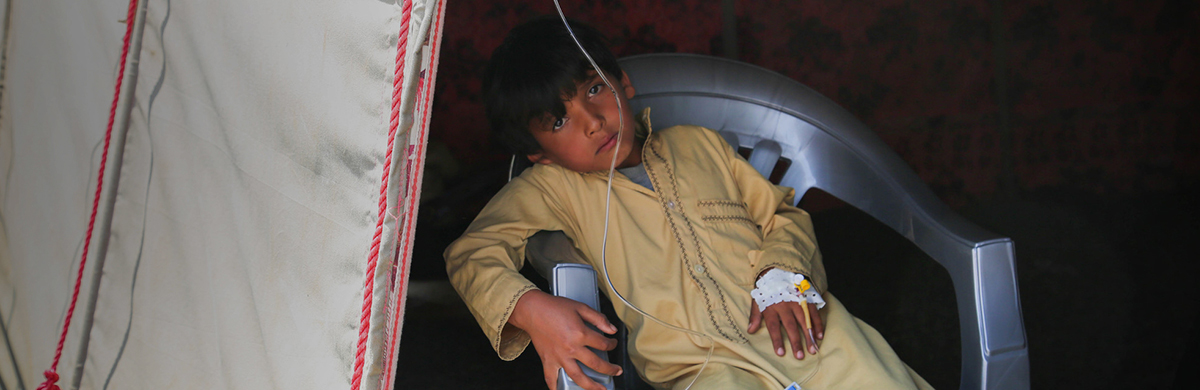 Banner image: Seven-year-old Ahmed*, infected with cholera, waits in an isolation tent until a hospital bed is made available.