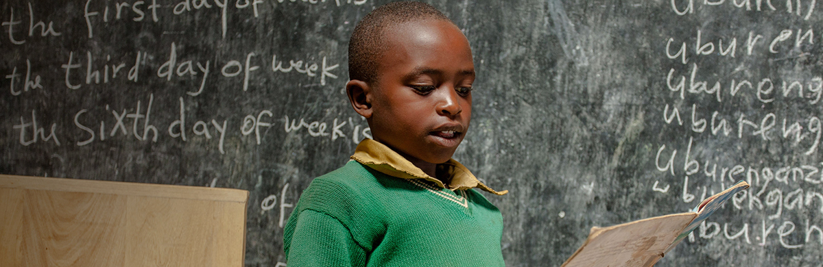 Sammy reads a children’s book written in Kinyarwanda in his classroom at his school in Gicumbi district, Rwanda.